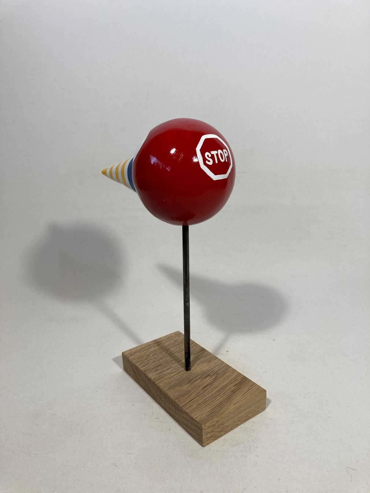 Sur son corps trône un insigne graphique, emprunté à la signalétique contemporaine - ici "stop!" – rappelant ces panneaux qui nous dictent la marche à suivre : Fais ci, fais pas ça...
