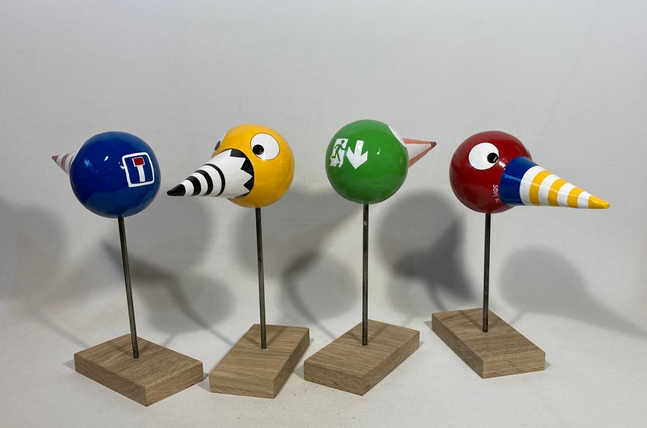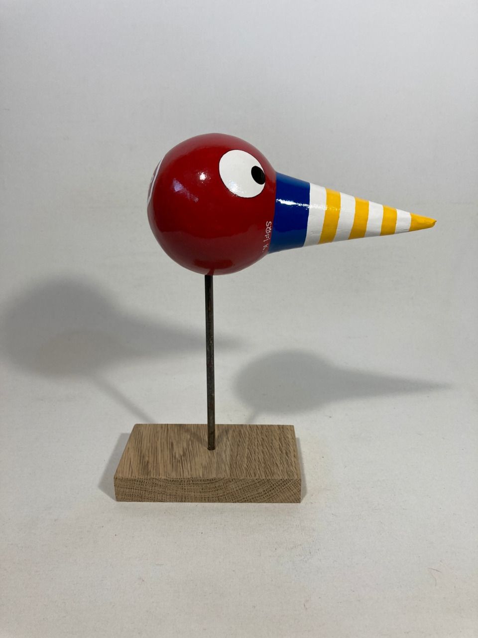 Montée sur une tige en acier fixée à un socle en chêne massif, cette créature en plâtre au long bec s’inspire librement de l’esprit des Shadoks : absurde, naïve et profondément humaine.