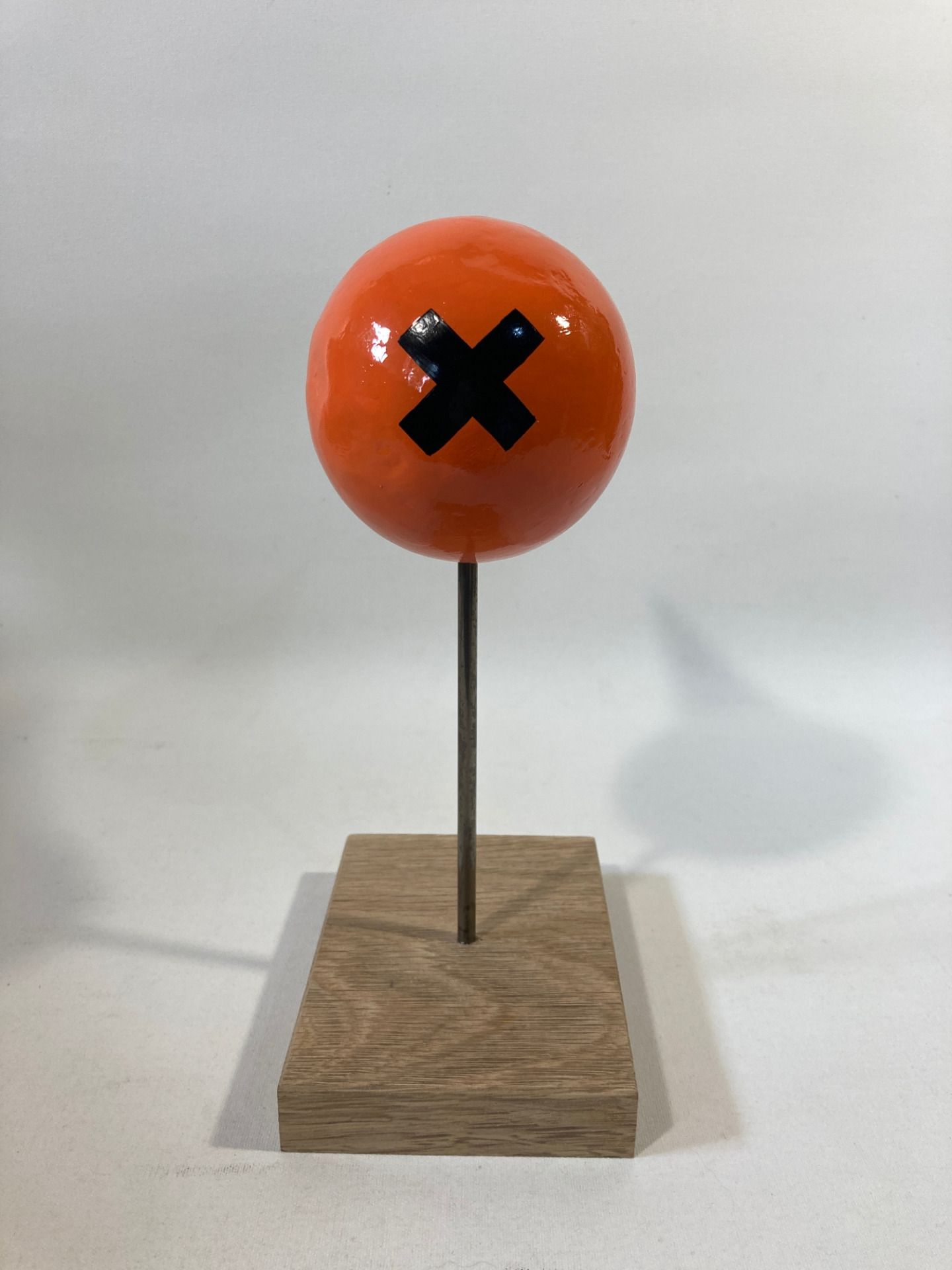 Sur son corps trône un insigne graphique, emprunté à la signalétique contemporaine - ici irritant – rappelant ces panneaux qui nous dictent la marche à suivre : Fais ci, fais pas ça...