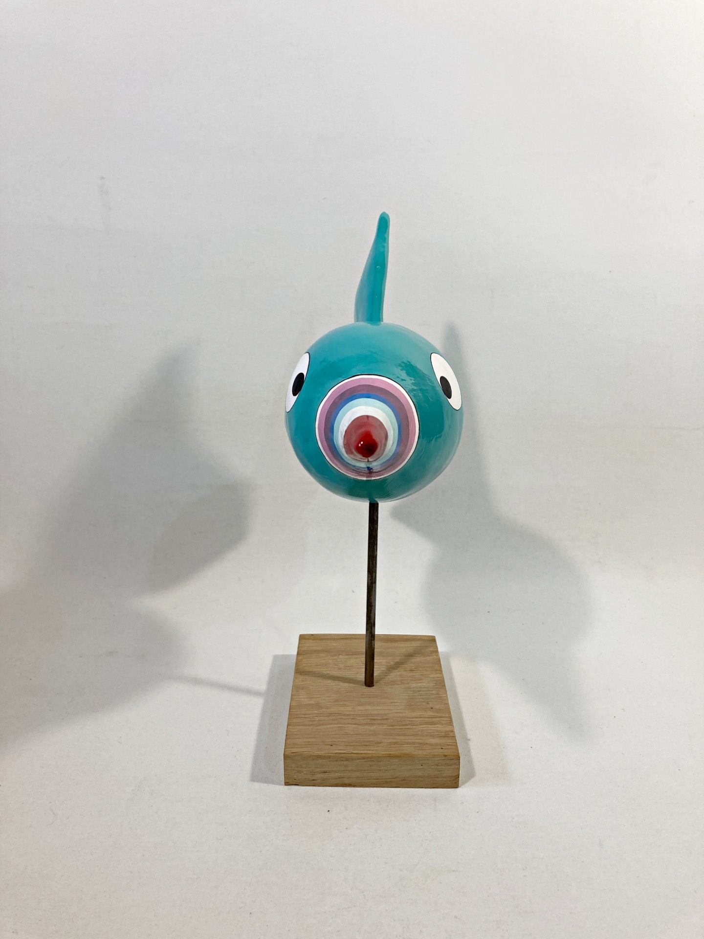 “BOA” – poisson bleu lagon en plâtre, long bec rayé rose, blanc et mauve. Sculpture expressive et unique signée Sofi K.