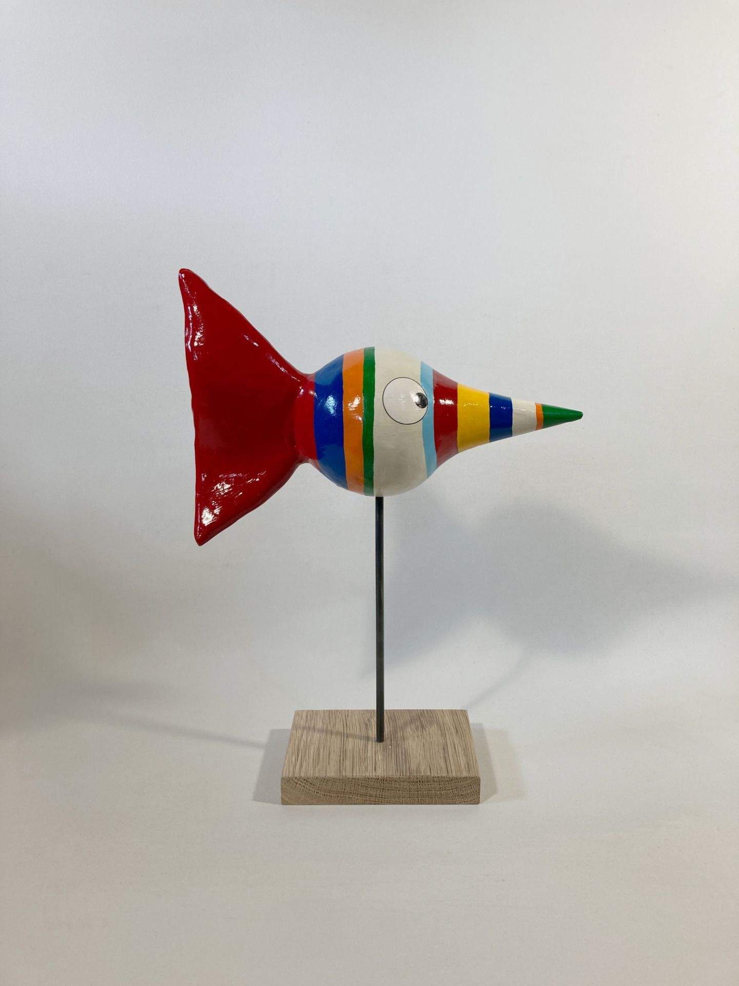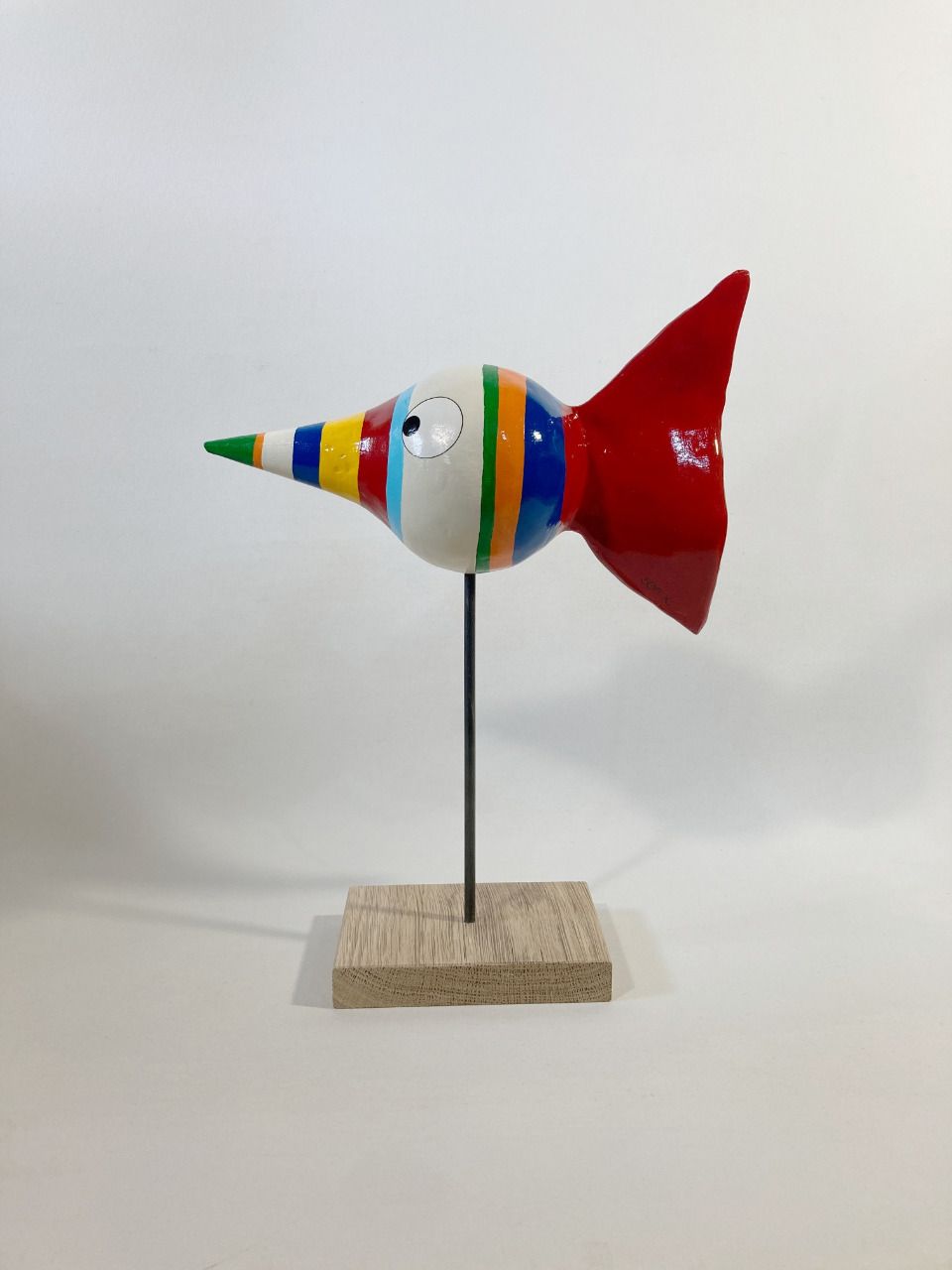 Poisson pop coloré en plâtre, inspiré des bouchons de pêche. Sculpture ludique et poétique signée Sofi K.