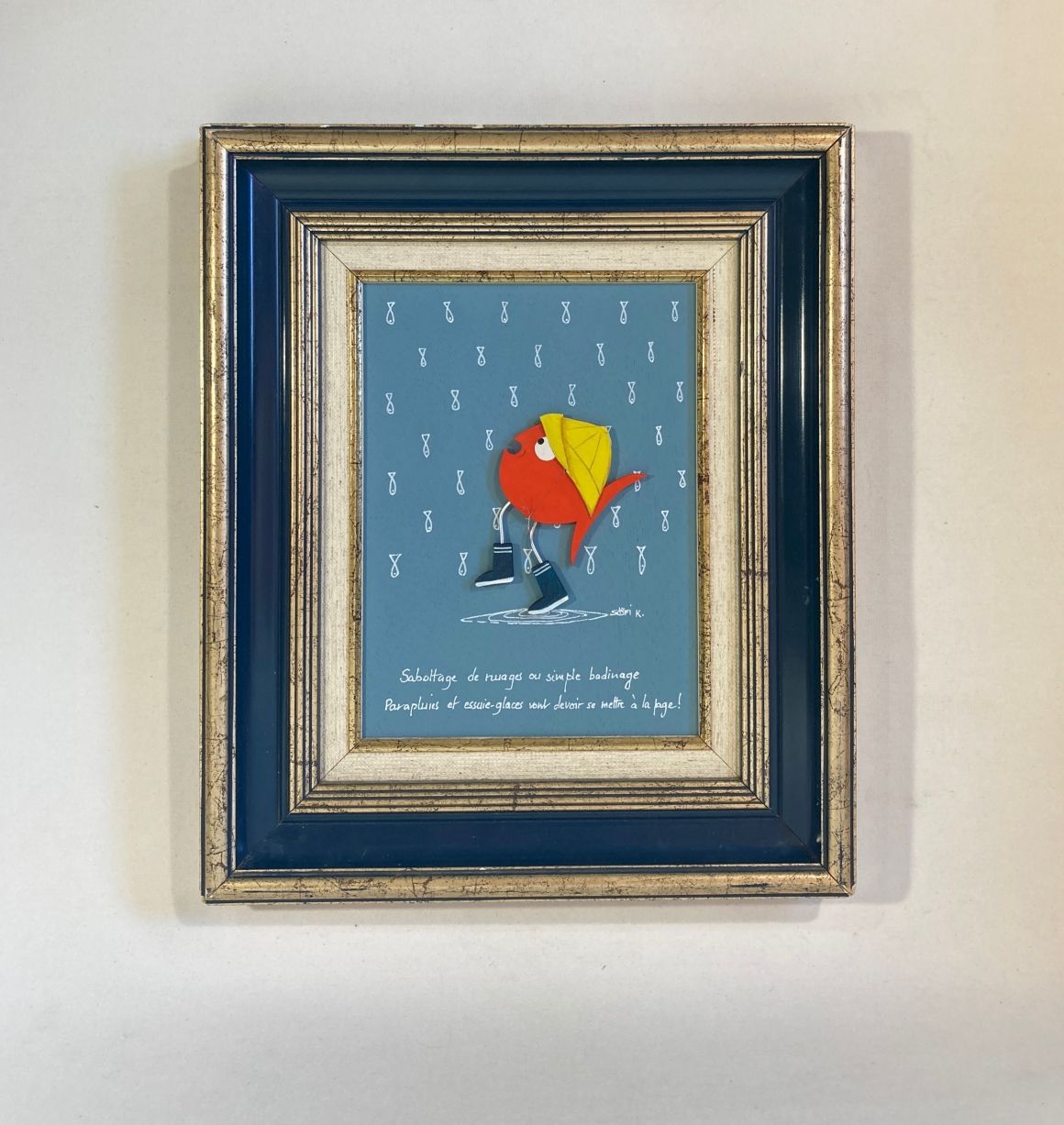 Le cadre bleu et doré chiné en brocante vient souligner cette dualité : à la fois élégant et singulier, il encadre la scène comme un instant suspendu, un souvenir étrange capturé entre rêve et réalité. Le contraste entre le raffinement du cadre et l’absurdité joyeuse du sujet crée une tension visuelle propre à l’univers de l’artiste.