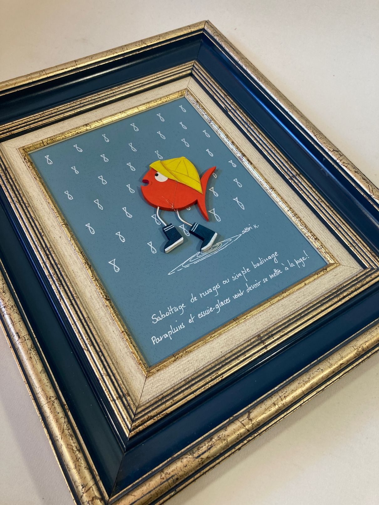 Un poisson rouge en bottes bleues et chapeau jaune affronte une pluie de sardines : un tableau baroque pop signé Sofi K., drôle, poétique et plein de fraîcheur.