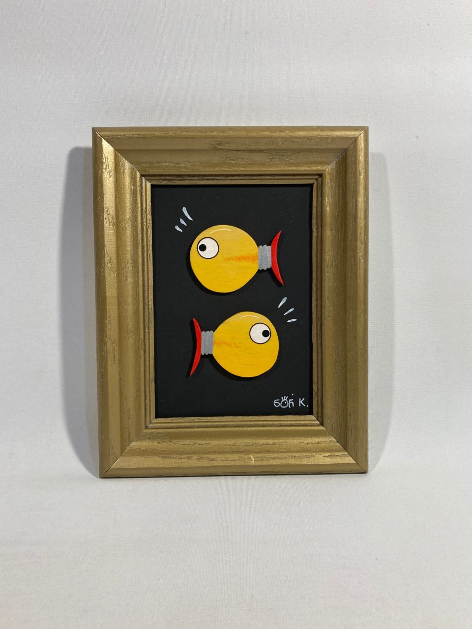 “Illuminatis” : un couple de poissons-ampoules scintille dans un cadre doré. Un petit format baroque pop signé Sofi K., entre poésie, humour et lumière.