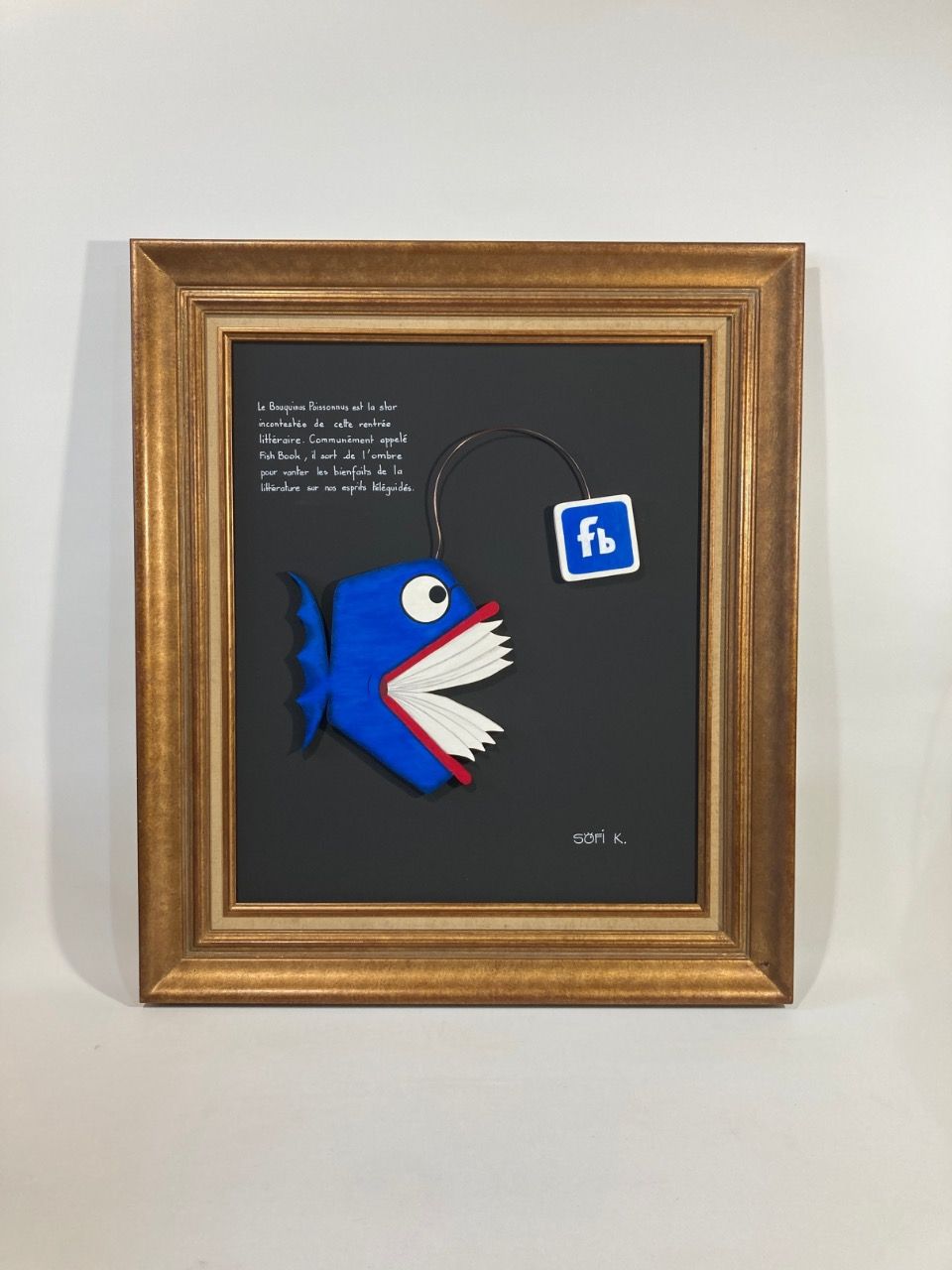 Avec « Fish Book », Sofi K. propose une œuvre baroque-pop résolument contemporaine, à la croisée de l’objet, de l’animal et du symbole numérique. Dans un cadre ancien chiné en brocante, ce tableau met en scène un poisson bleu en forme de livre, dont l’extension évoque subtilement les codes visuels des réseaux sociaux.