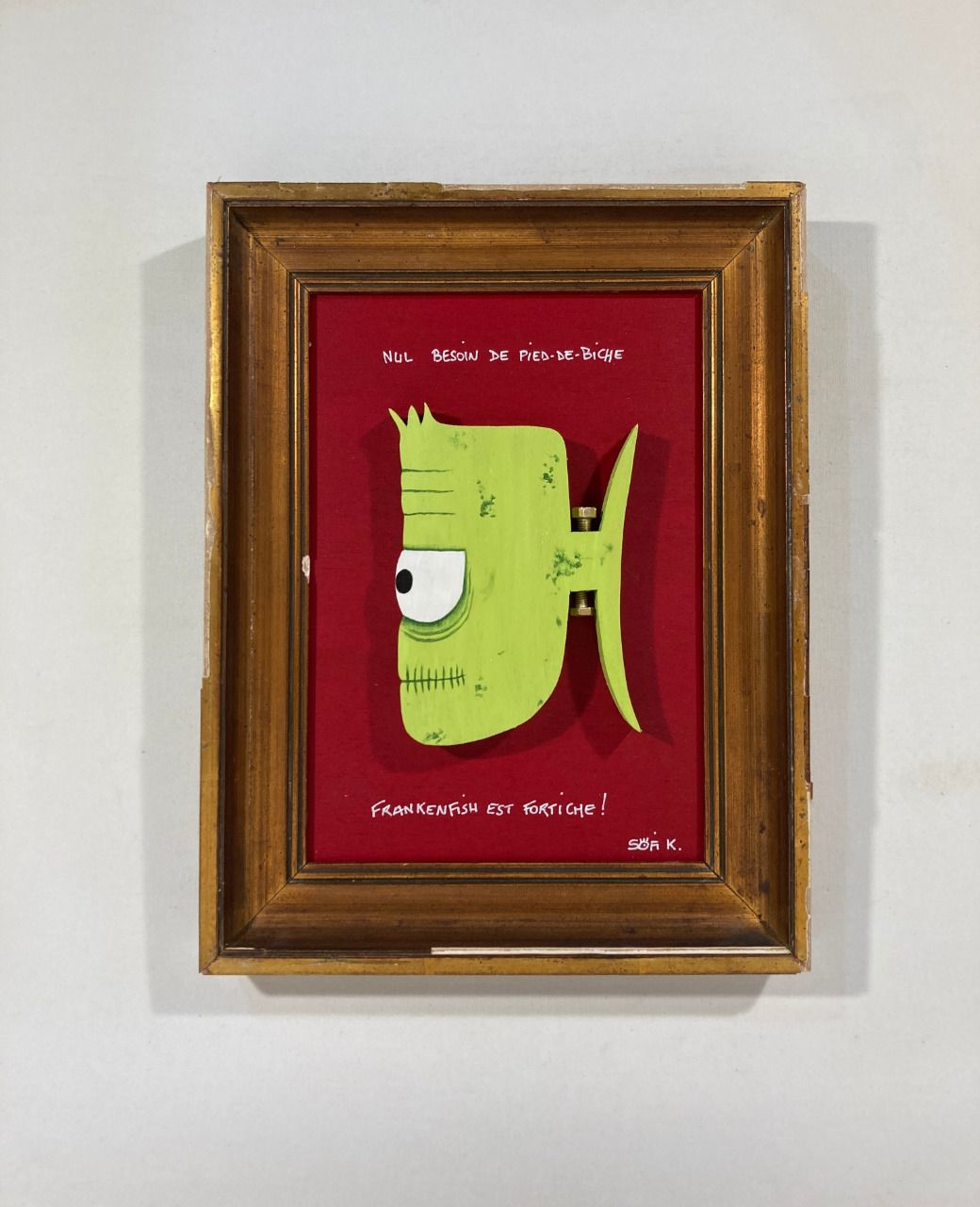« Frankensfih » est une créature née de l’imaginaire débridé de Sofi K., à la croisée du mythe de Frankenstein et de l’univers marin. Présentée dans un cadre ancien chiné, l’œuvre évoque un portrait issu d’un cabinet de curiosités revisité. Le contraste entre l’élégance baroque du cadre et la fantaisie pop du sujet renforce l’aspect théâtral de la scène. Frankensfih ne fait pas peur : il intrigue, amuse et attend presque qu’on l’adopte.