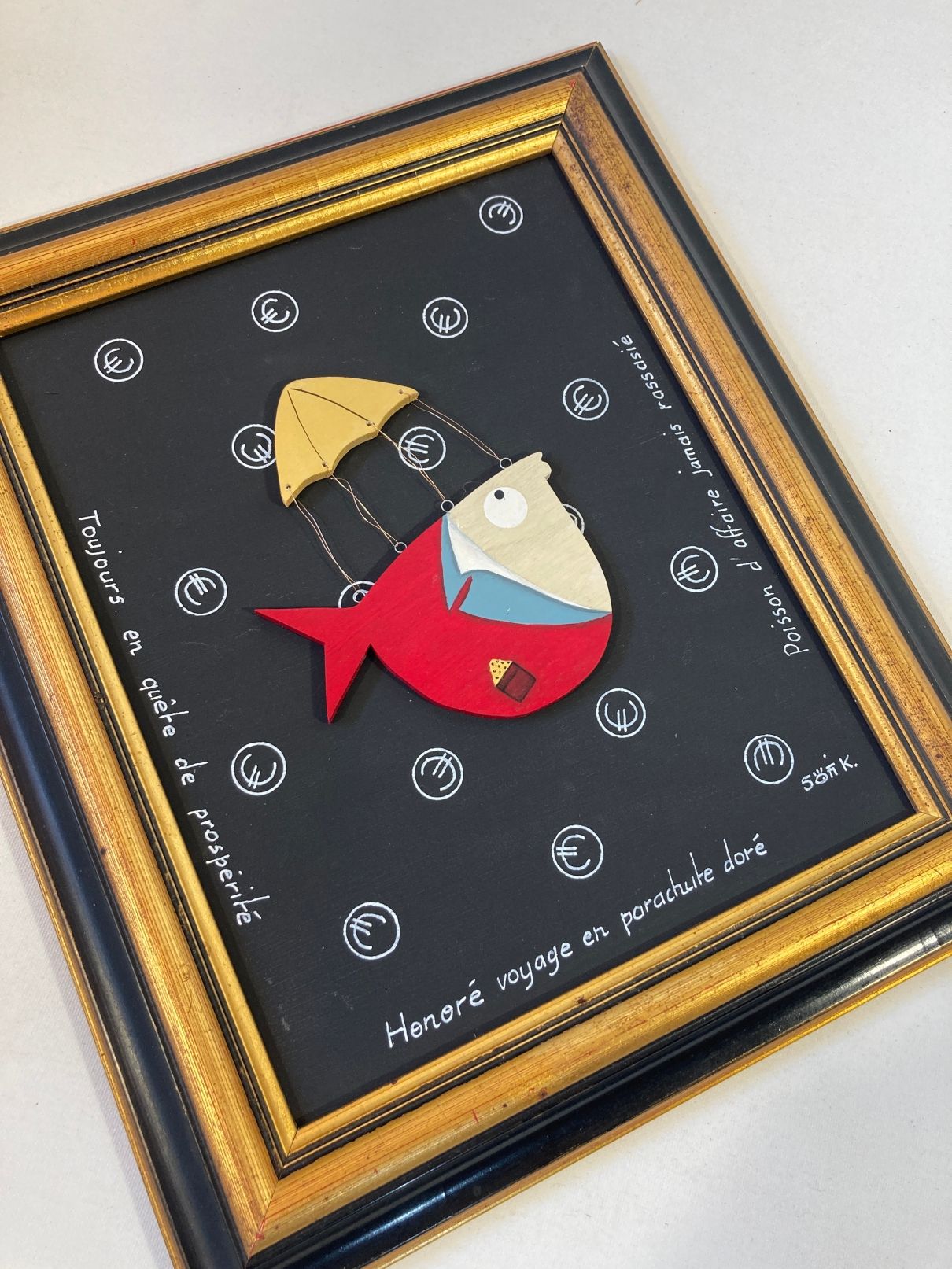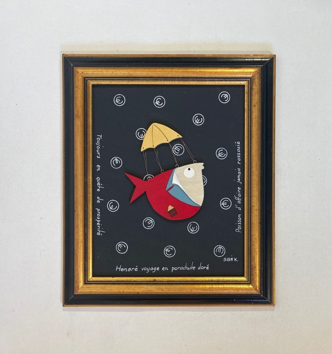 Un poisson en costume descend sous parachute doré sur fond noir parsemé d’euros : un tableau baroque pop signé Sofi K., élégant, drôle et visuellement percutant.