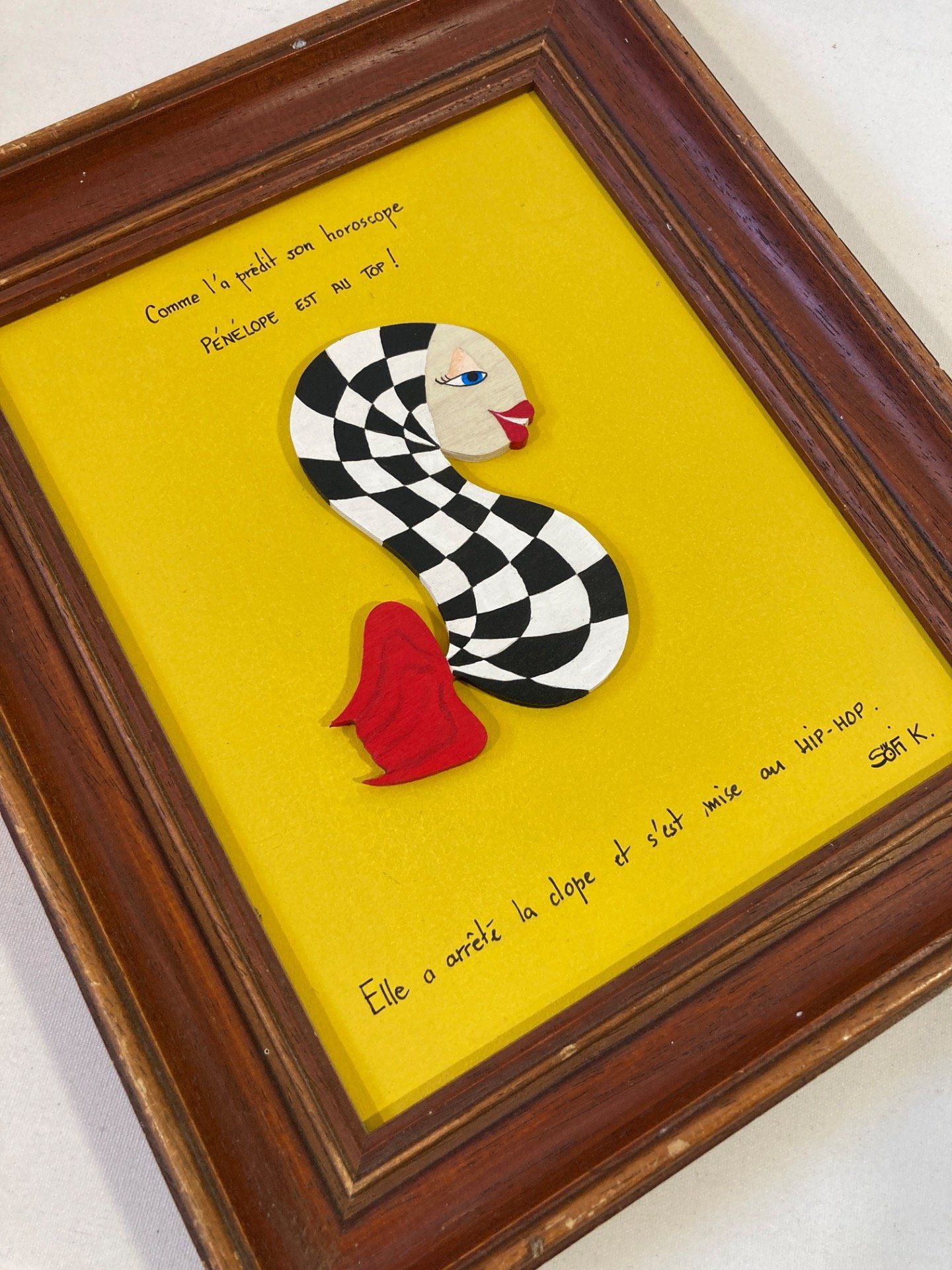 Présentée dans un cadre bois brut chiné en brocante, l’œuvre joue sur un contraste subtil entre la simplicité naturelle du support et le raffinement visuel du sujet. Le damier noir et blanc, à la fois intemporel et audacieux, confère à Pénélope une allure sophistiquée, presque haute couture, tout en renforçant son impact visuel.