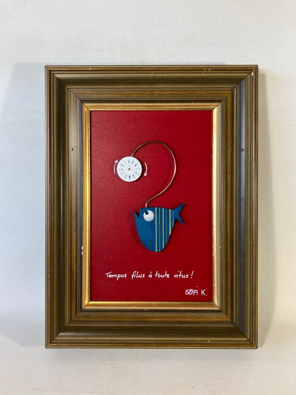 Découvrez Tempus Filus, un tableau baroque au charme délicieusement rétro, présenté dans un cadre en bois ancien soigneusement chiné. Cette petite œuvre surprenante met en scène un poisson imaginaire dont le filament pêcheur porte un minuscule cadran de montre pivotant, clin d’œil poétique à l’incessante fuite du temps.