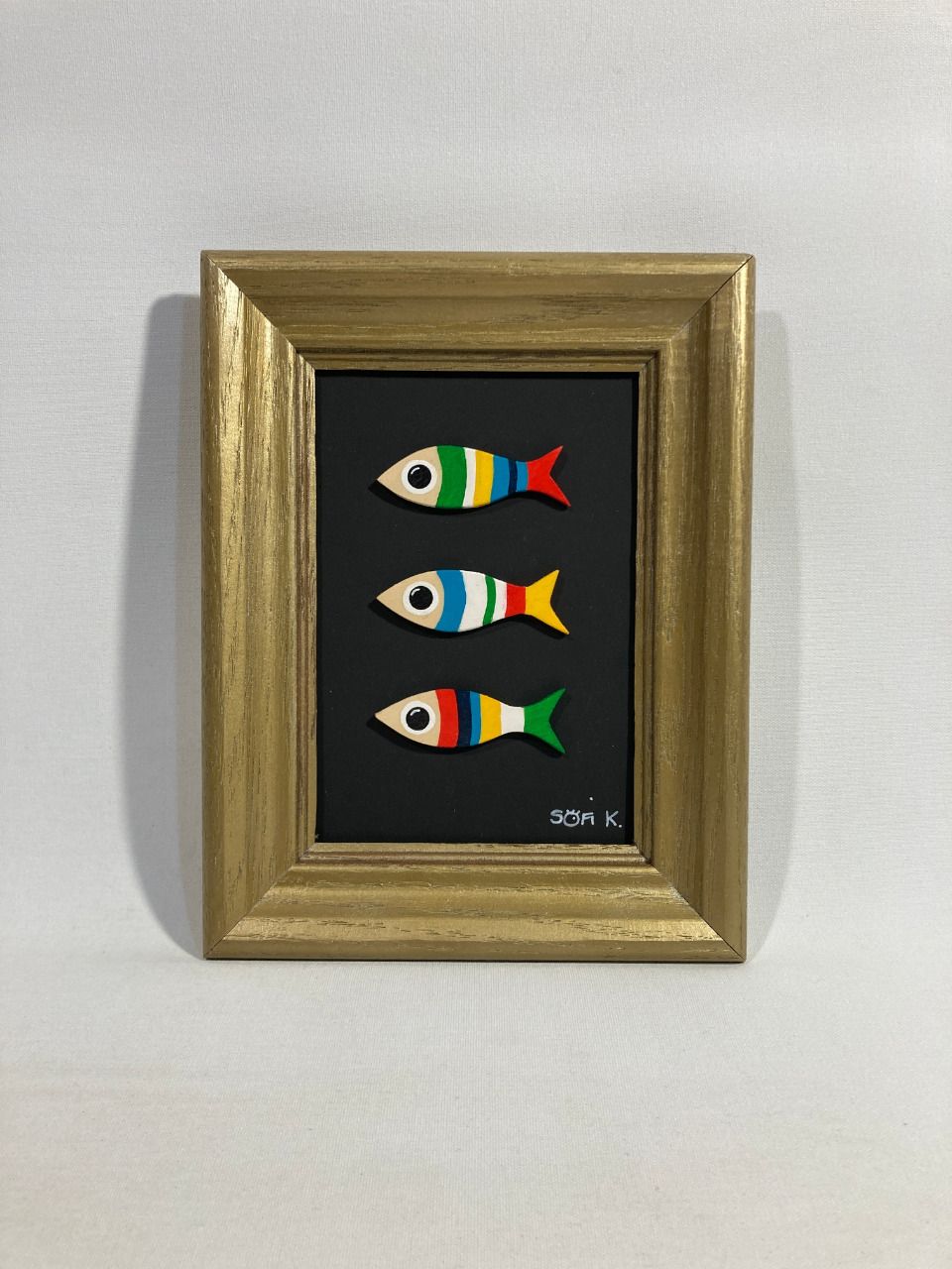 Ce petit format baroque-pop, signé Sofi K., met en scène un trio de sardines rayées multicolores qui semblent tout droit sorties d’un carnaval marin. Chacune arbore ses propres couleurs, ses propres lignes, son propre caractère, mais toutes trois avancent ensemble avec une énergie joyeuse et irrésistible.