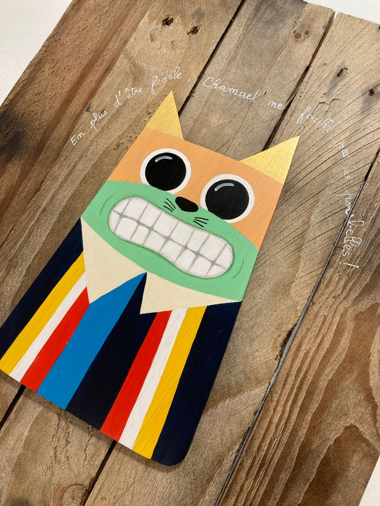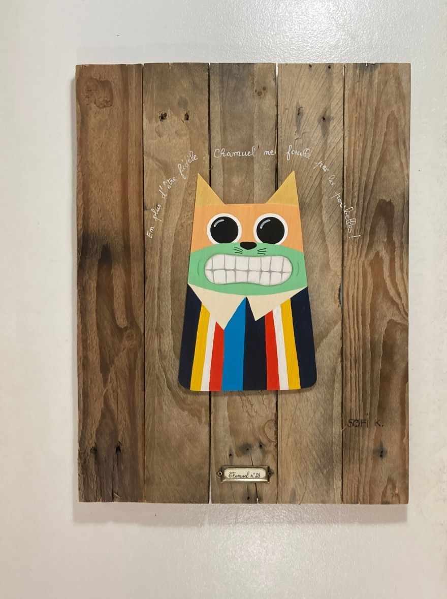Ce tableau en bois mêle humour, élégance et un soupçon d’absurde — idéal pour une déco qui ne se prend pas trop au sérieux mais qui aime soigner les détails, tout comme Chamuel soigne son image.