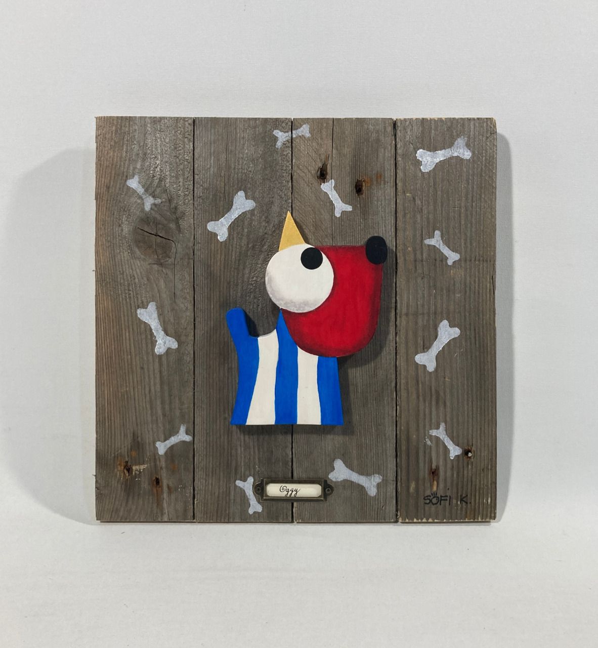 Ce tableau en bois met à l’honneur Oggy, un petit chien rayé et coloré, au regard malicieux et à la personnalité lumineuse.