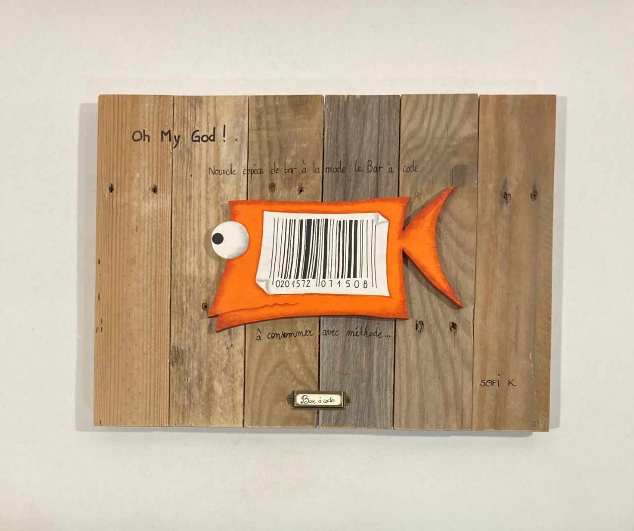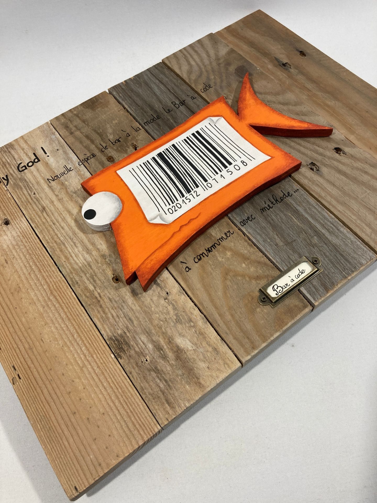 Ce tableau en bois intitulé “Bar à code” met en scène un poisson orange vif, clin d’œil malin au bar et au code-barre.
