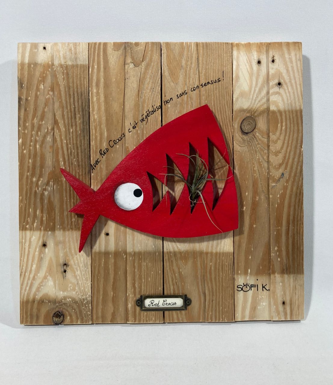 Le tableau en bois “Red Crocus” met en scène un poisson rouge flamboyant, mi-poisson mi-crocodile, avec une mâchoire bien dentée et un Tillandsia lové en son centre.