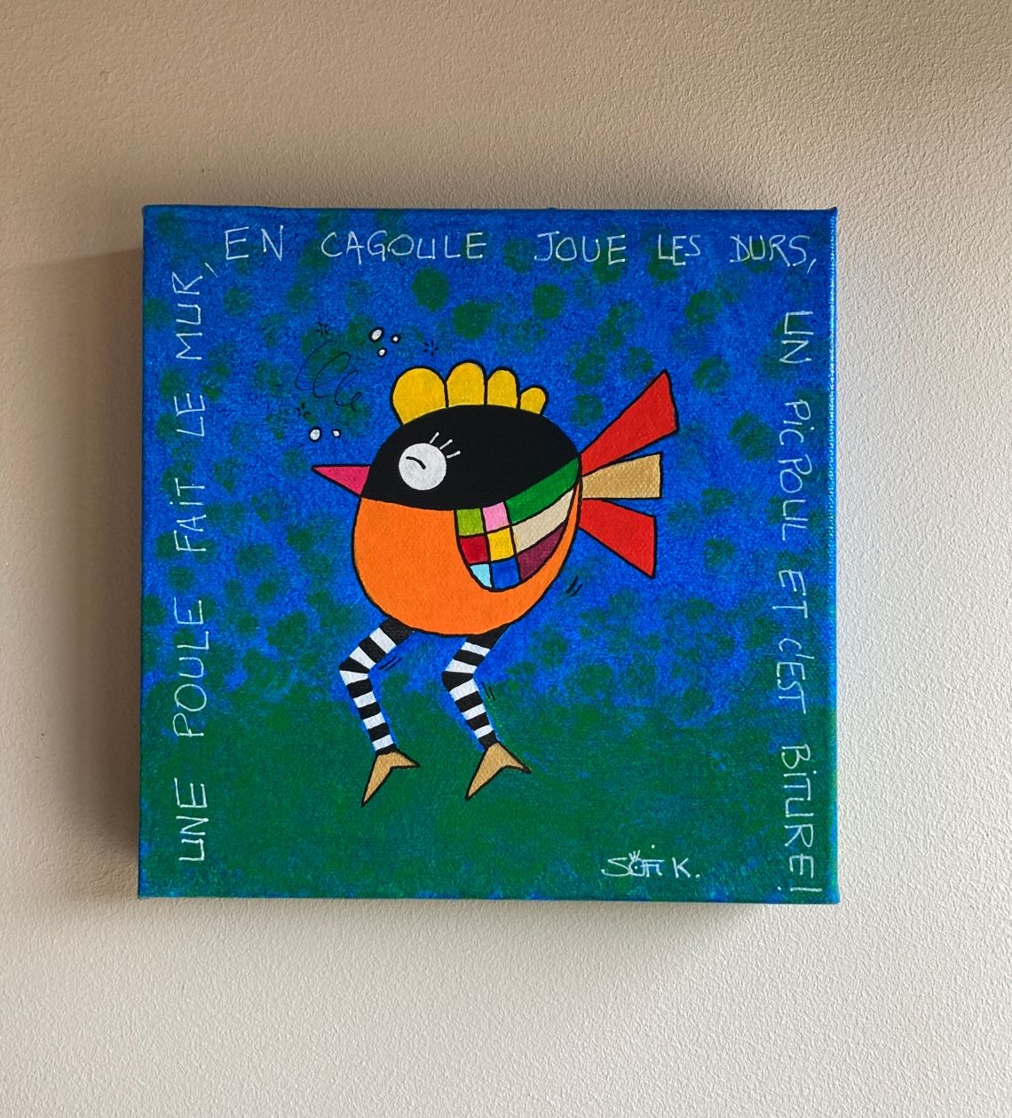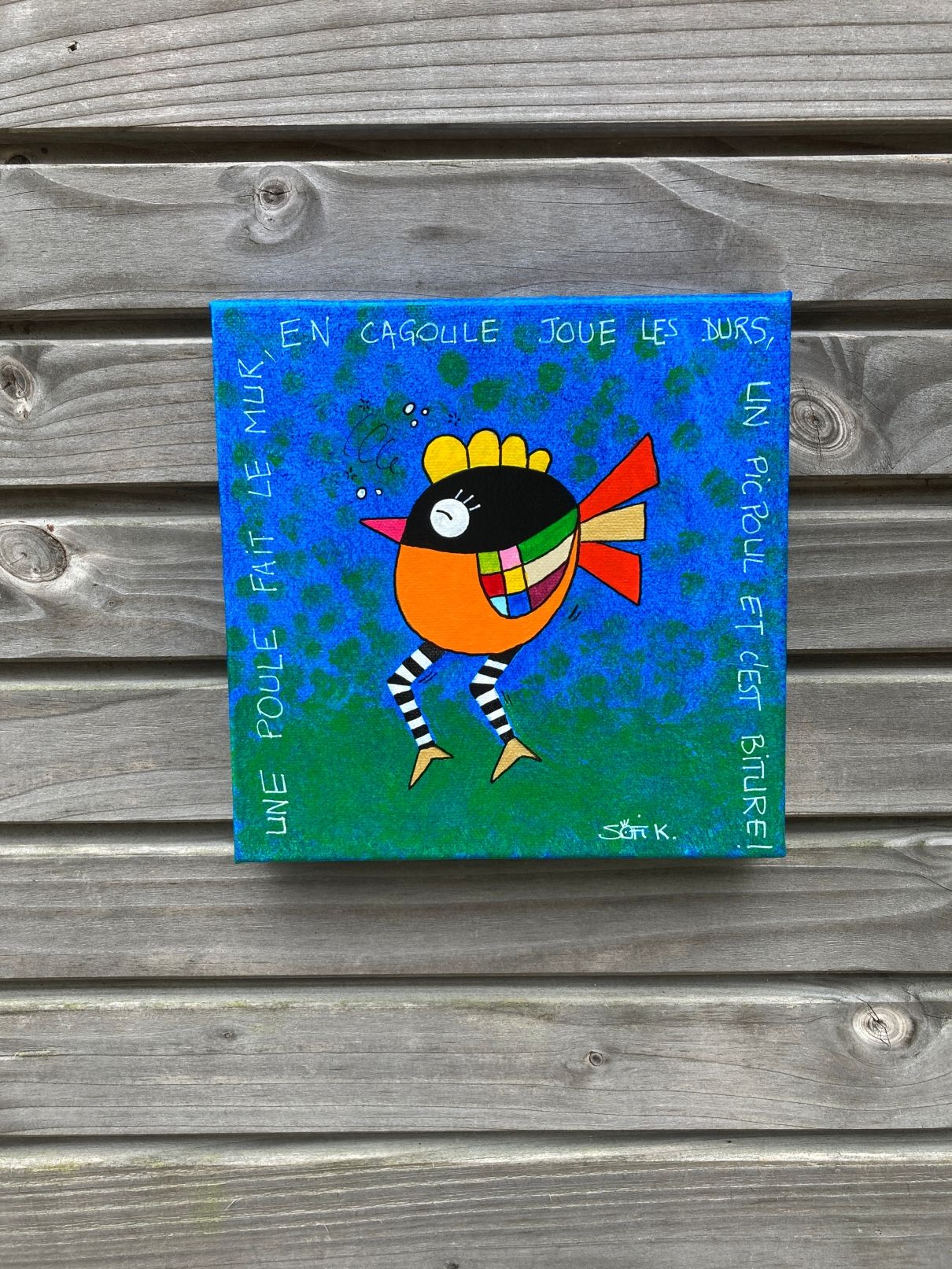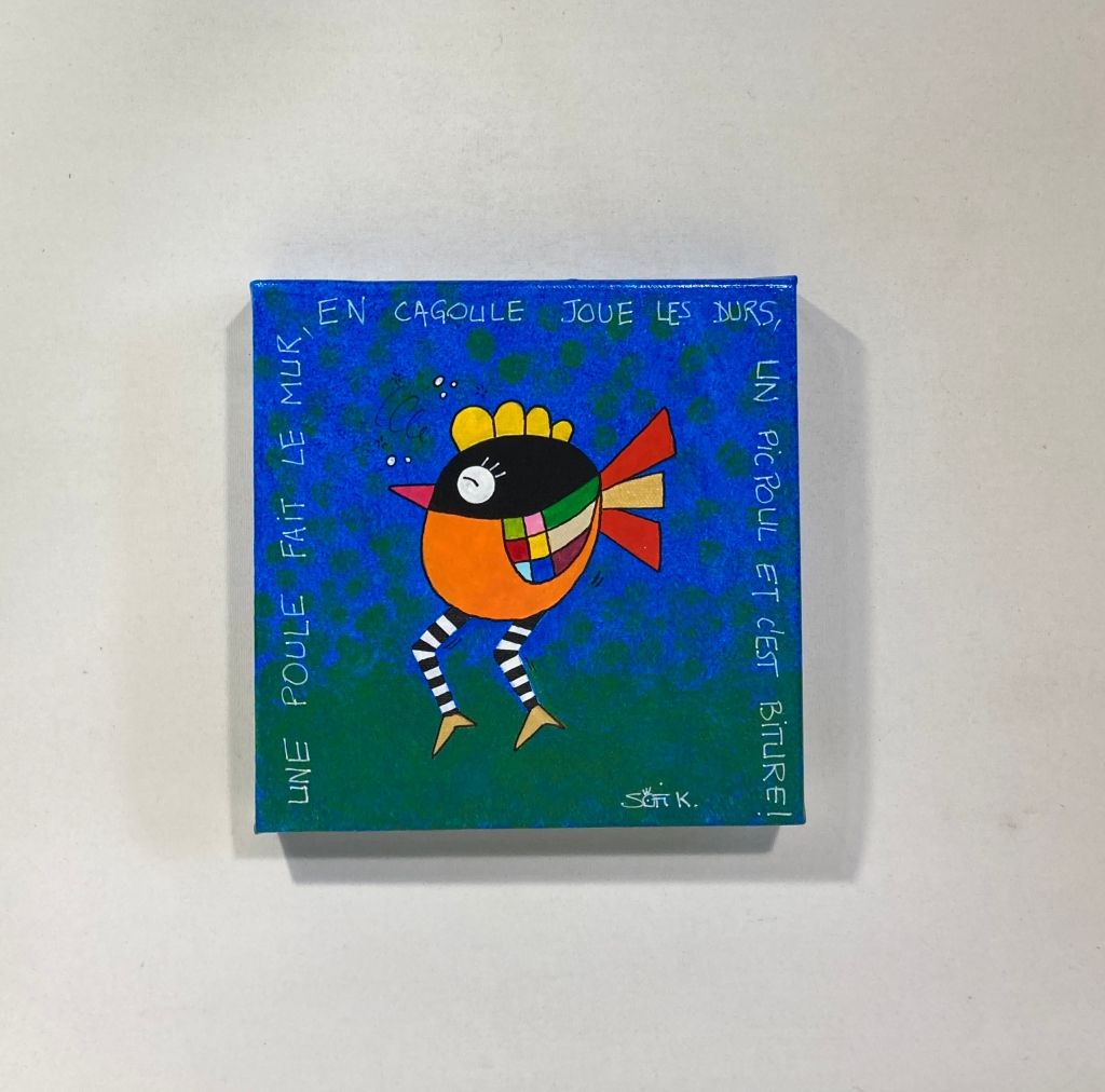 Cette toile originale au format 20x20 cm met en scène une poule masquée au caractère bien affirmé, intitulée “Biture”. À travers cette figure animale revisitée, Sofi K propose une œuvre à la fois ludique, décalée et expressive.