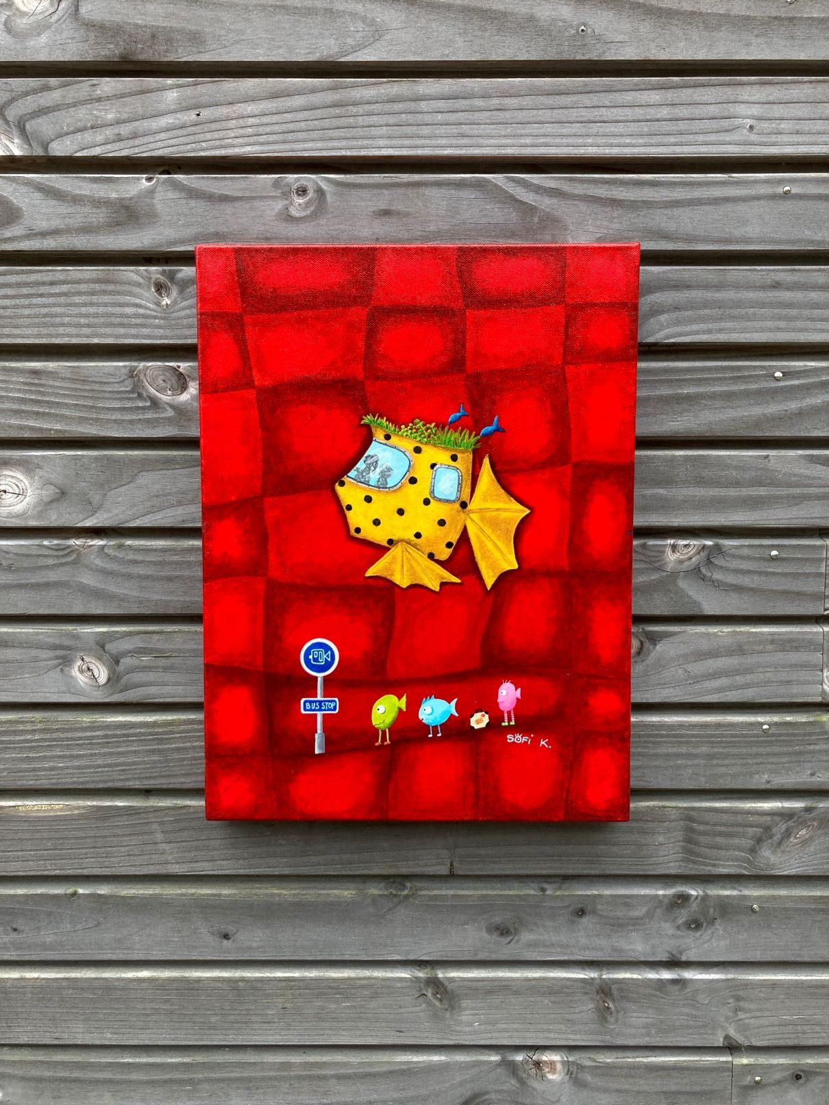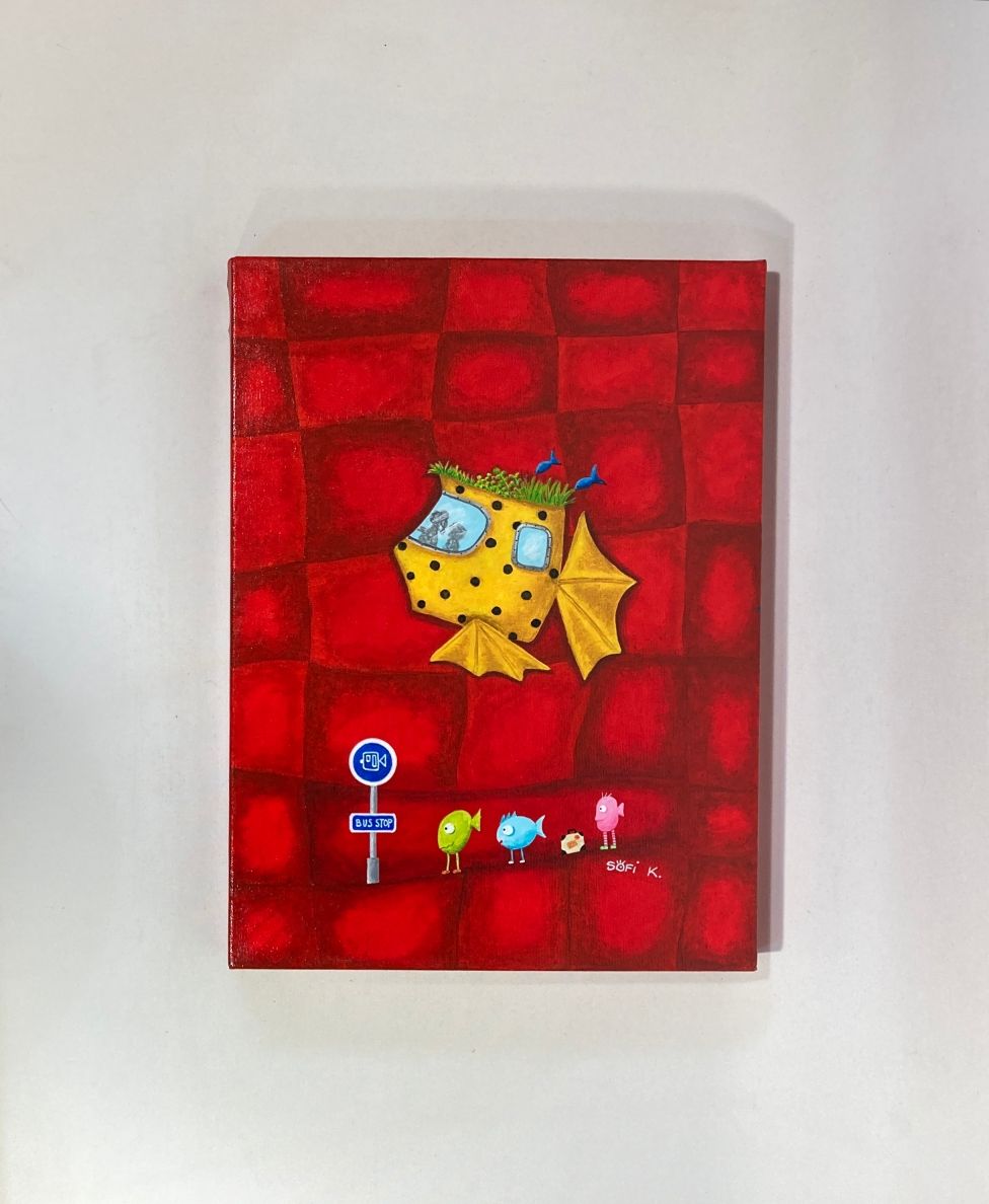 Cette toile originale au format 40x30 cm propose une scène surréaliste et narrative, emblématique de l’univers artistique de Sofi K. On y découvre un poisson transformé en bus, approchant d’un arrêt improbable où patientent des poissons sur pattes, équipés de bagages, comme prêts à embarquer pour un voyage insolite.