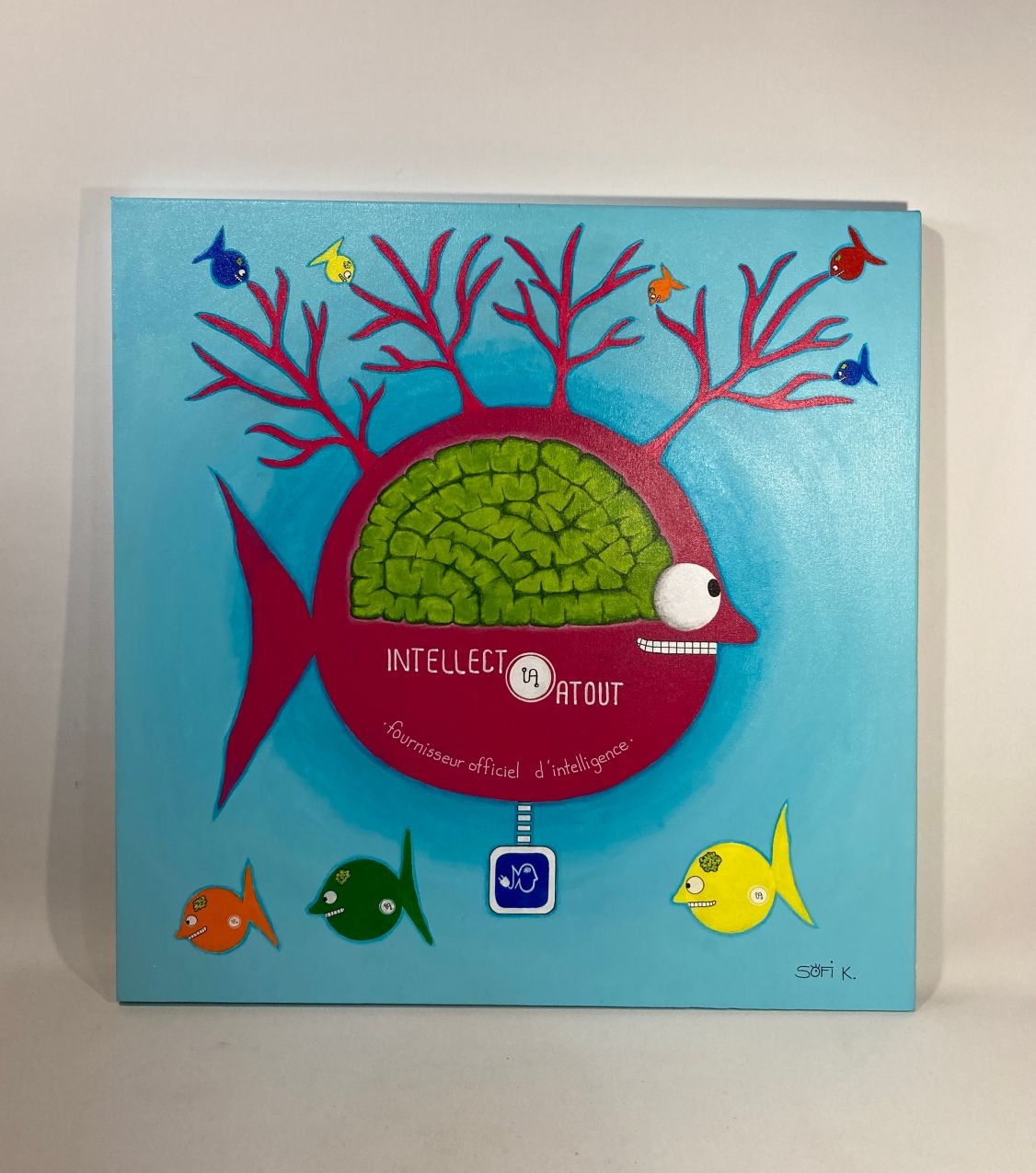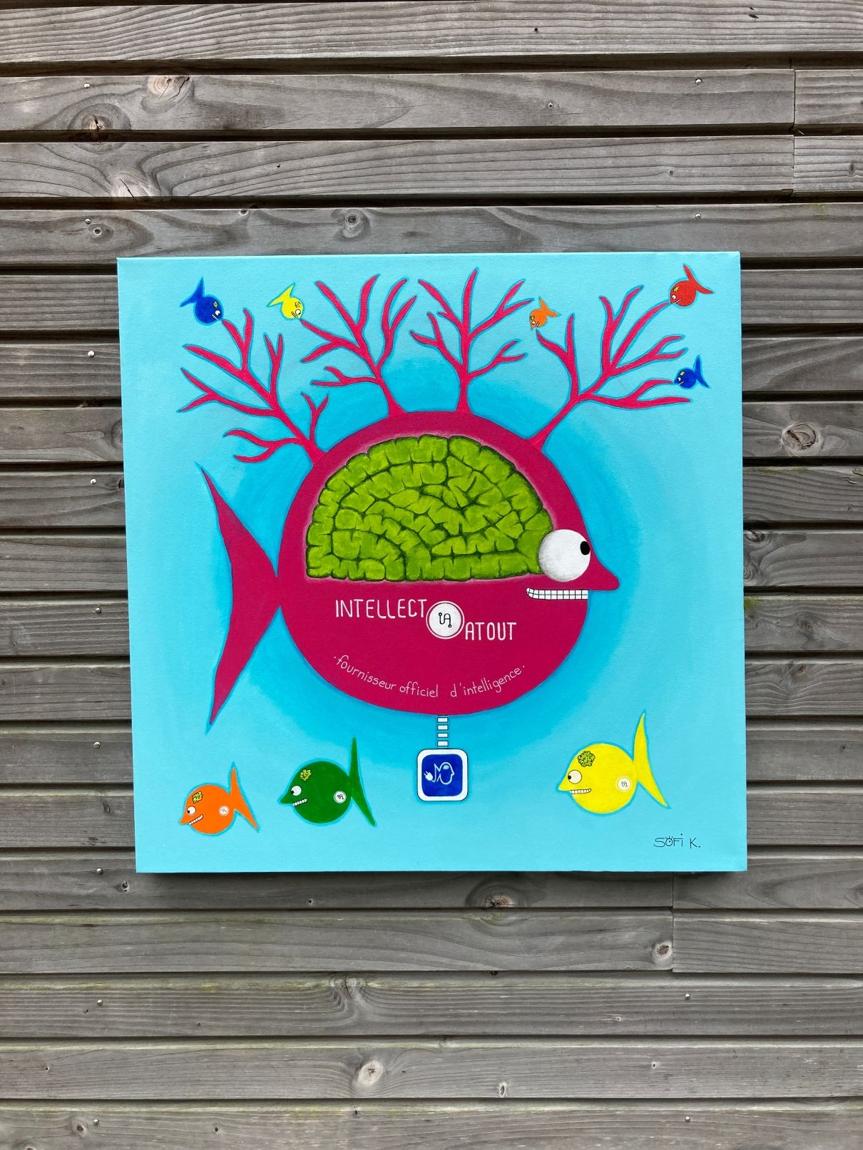 Cette toile originale au format 60x60 cm s’inscrit dans une démarche artistique à la fois narrative, satirique et contemporaine. Intitulée autour de l’idée d’“IA – Intellect Atout”, elle met en scène un poisson-mère doté d’un cerveau surdimensionné, véritable centre névralgique d’un système organique.