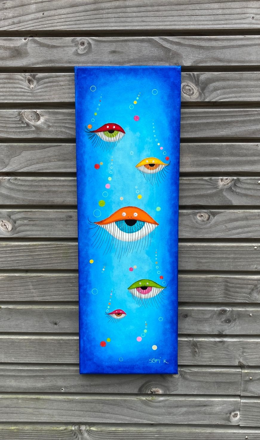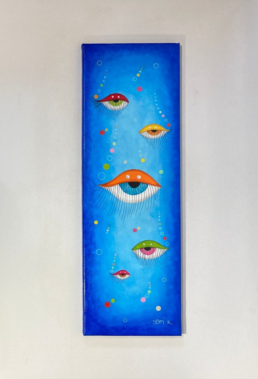 Cette toile originale au format 60x20 cm propose une immersion dans un univers aquatique revisité, propre à l’imaginaire de Sofi K. Elle met en scène un ensemble de formes hybrides, à mi-chemin entre l’œil et la méduse, flottant en lévitation dans un espace bleuté.