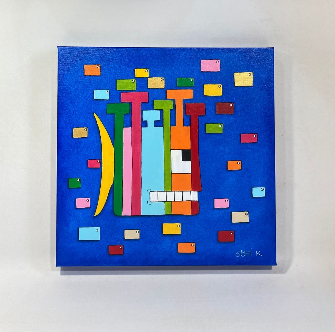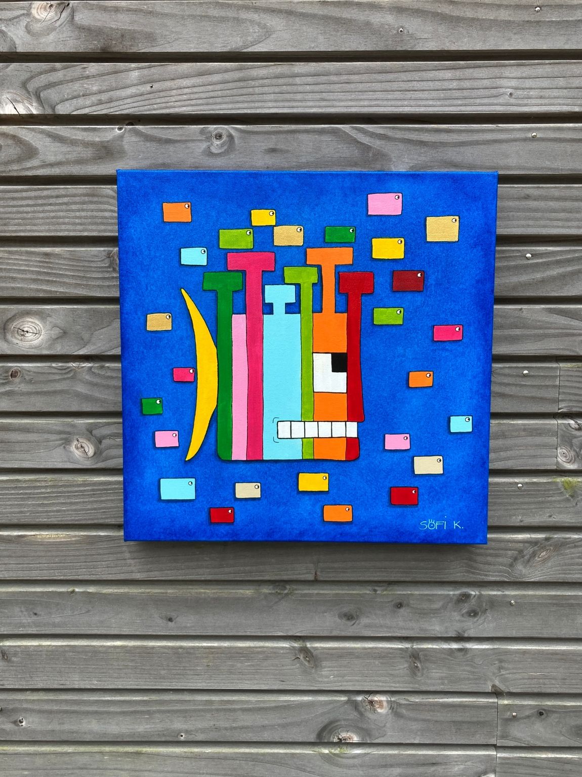 Cette toile originale au format 40x40 cm, intitulée “Invasion”, propose une composition visuelle dense et rythmée, caractéristique de l’univers de Sofi K. Elle met en scène un poisson singulier, dont le corps est prolongé par des excroissances colorées en forme de rectangles, comme une mutation graphique en cours.